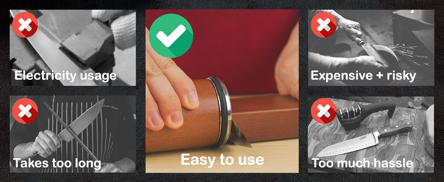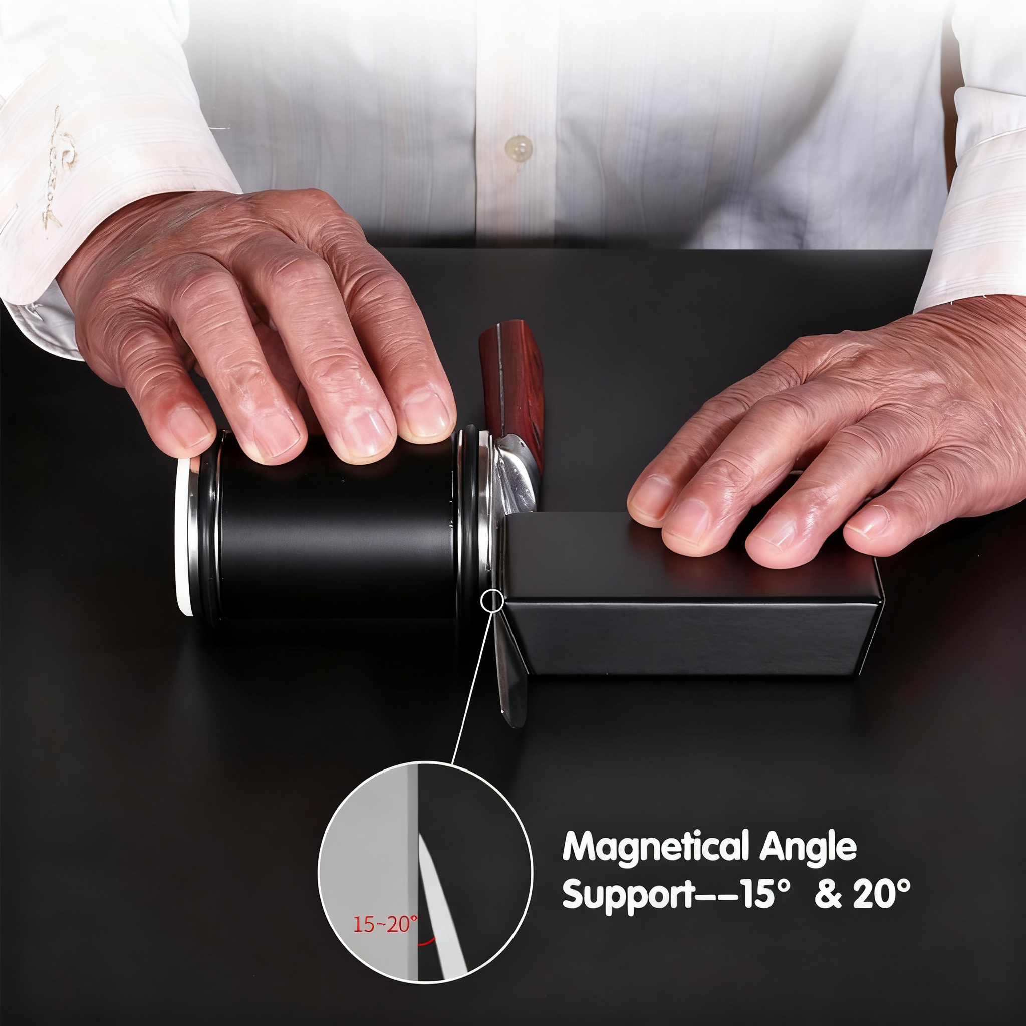 - Strong Magnetic Base - Magnets on both sides securely hold the knife during sharpening.