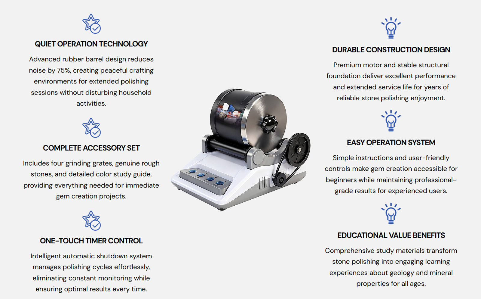 - Enduring Value: The tumbler itself is durable and easy to operate, and it continuously rewards the user by transforming ordinary rough stones into dazzling gems, providing ongoing achievement and discovery.