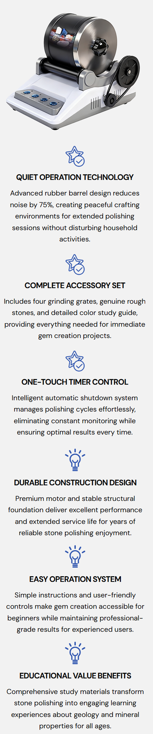 - Versatile Design: Through the combination of customized grit sets and optimized tumbling cycles, it ensures that every stone receives its best-possible polishing treatment, achieving professional-grade luster and smoothness.